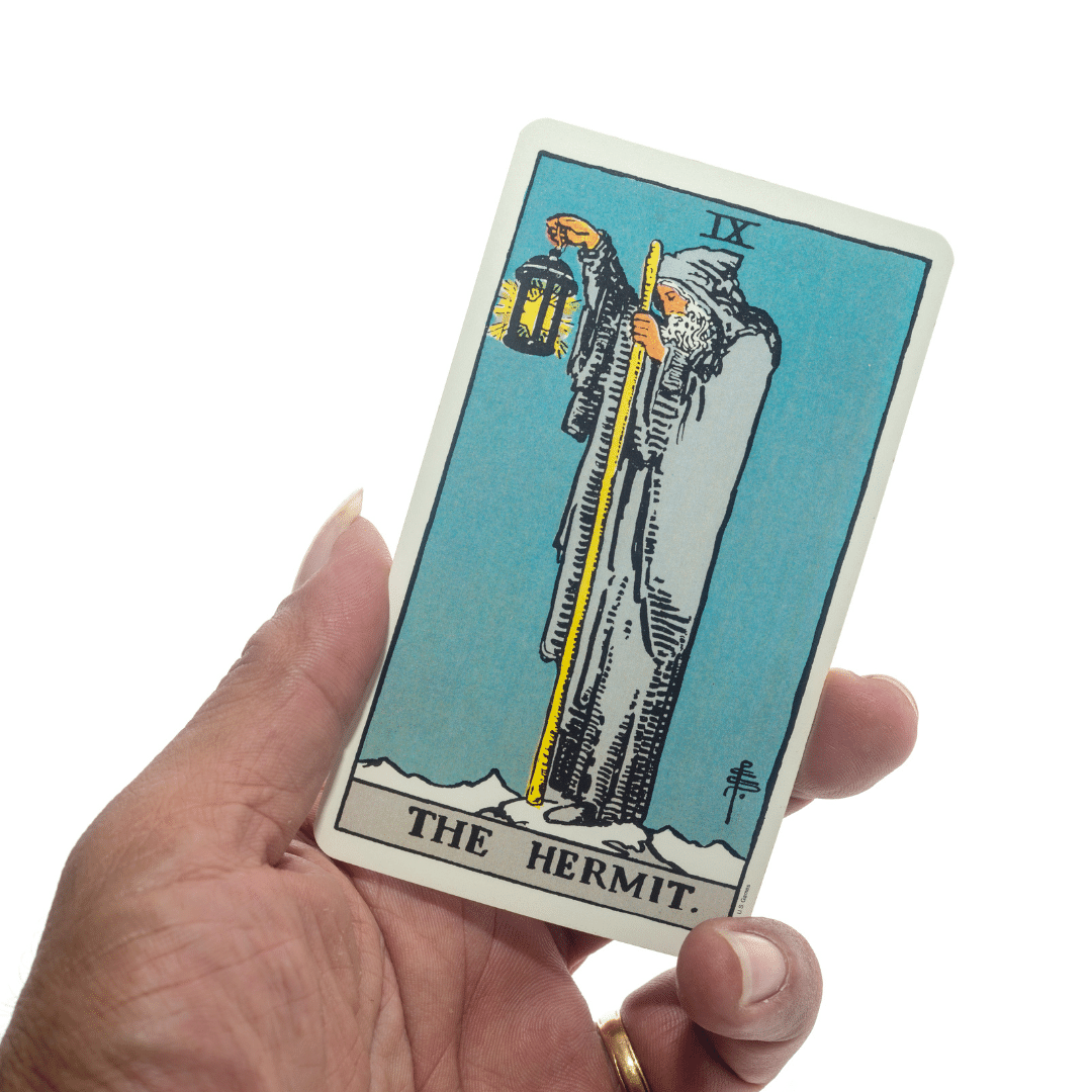 The Hermit is the ninth Major Arcana card in the tarot deck. It depicts an elderly figure holding a lantern while standing alone on a mountain peak. The lantern represents inner guidance, wisdom, and the light of knowledge. The Hermit symbolizes introspection, solitude, spiritual growth, and seeking truth. It encourages withdrawing from distractions to focus on inner wisdom and self-discovery.